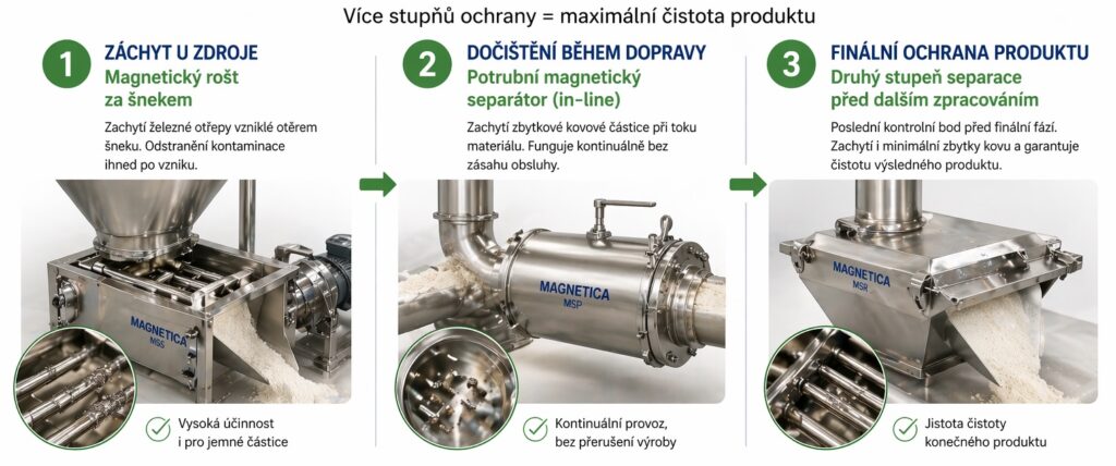 Navrhli jsme vícestupňovou magnetickou separaci podle místa vzniku kontaminace: